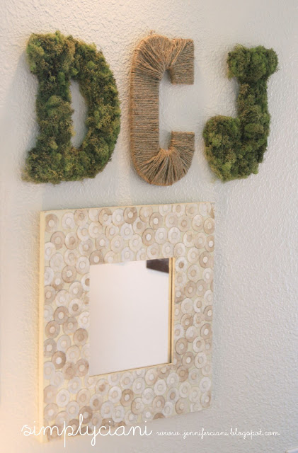 I bought all 3 plain letters and supplies from Michael's then covered them. A great way to personalize any room in your home! Cover with moss (pre-bagged at Michael's) & rope (also from Michael's) using hot glue. And there you go, in less than an hour you have created personalized wall art
