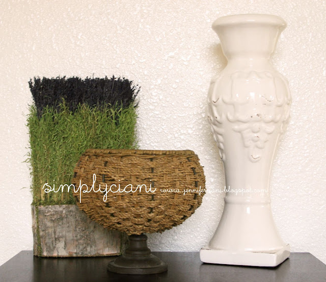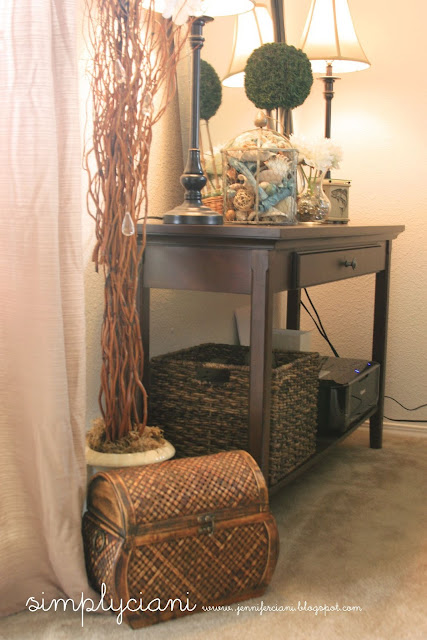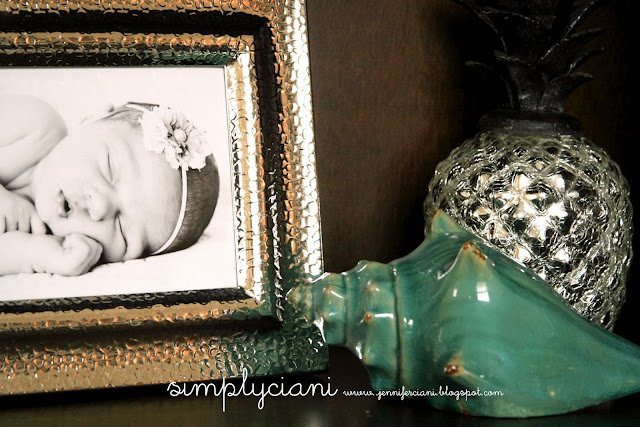 Creating little special vignettes is my favorite thing to do, photographing them is probably my second favorite. I love bringing personality into a room using a mix of old and new finds. This plain white picture frame was another one that I found at Michael's then just hot glued a pink bow to it. The mason jar was a local antique find, and the glass vase and faux florals were again from Michael's.