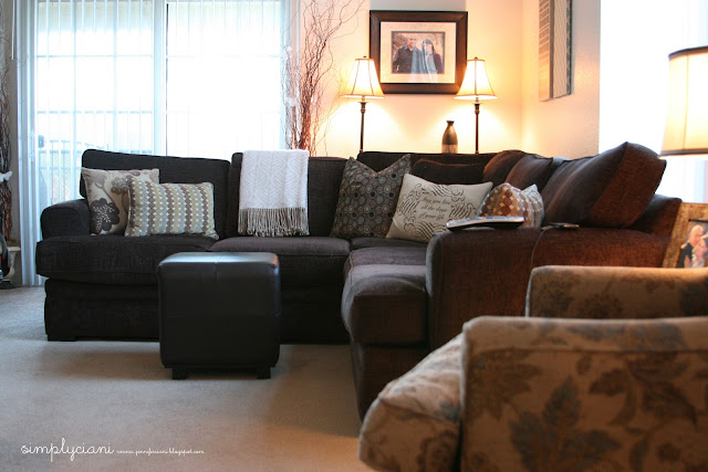 Living in Military Housing, there are many things that can be hard to overlook, like the plain stark white walls for example. In most military housing areas they allow you to paint, just as long as you re-paint back to the original color before moving out. For many military families, this seems like a huge daunting task since we never know how long we will really be in one home! In our home, we have painted a few accent walls, but in our living room, we have vaulted ceilings, so painting would require a large ladder and scaffolding, so paint is out of the question! Searching through my inspiration magazines/ and online inspirations, all of the rooms had been painted. So, my challenge: create a living room with character & warmth without the use of paint. Just because you may live in military housing does not mean that you have to live in a world of "plain". Bring in color with your accessories!
