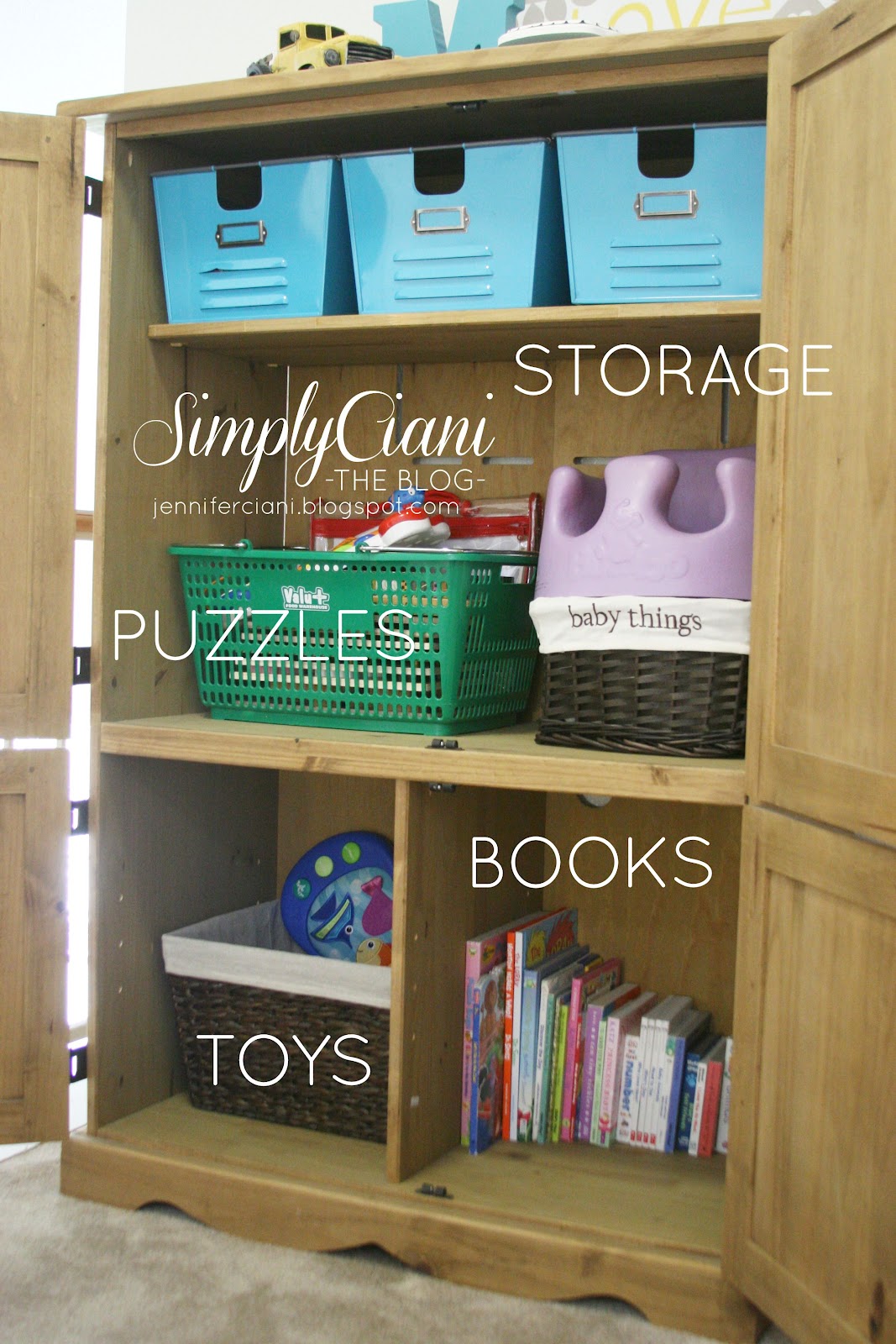 Being that we now have an almost 7 month old, our house is full of toys, books and anything to keep her entertained while she sits beside mommy so I can get some work done. Along with all of the toys, comes finding ways to somehow organize it all "stylishly". I wasn't looking to spend much money when it came to our new organizing dilemma, so I did what I do best . . . I shopped my own home first! We bought an old TV armoire for only $30 off of craigslist shortly before having our daughter, with plans to paint it, but never got around to it, so it sat in the garage. After having our baby, we moved the armoire into our room where it served a porpoise storing extra diapers, wipes and the extra "junk" that we didn't want to be seen. Pretty much it was useless. So after the toys started piling up, I decided that it would serve better as toy storage!