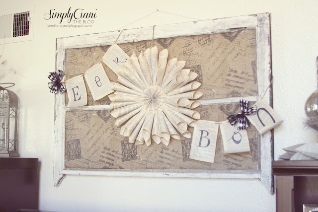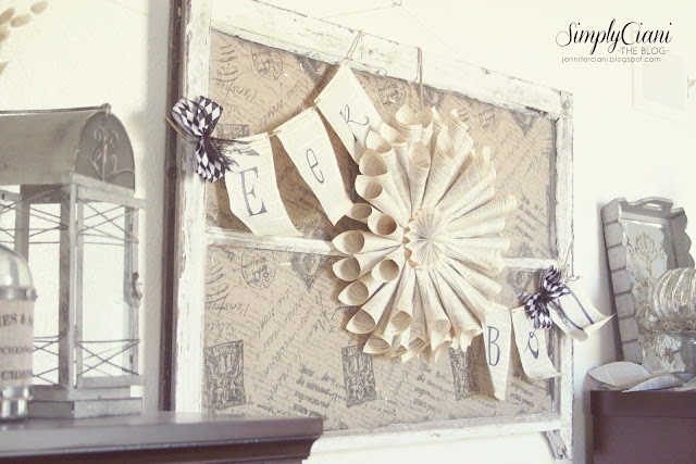 But the window with burlap alone was still pretty plain, so I decided to look around my house for something to use to spruce it up a bit. I came across and old book, which I used to make the wreath & banners, plus some leafy book page garland (below)