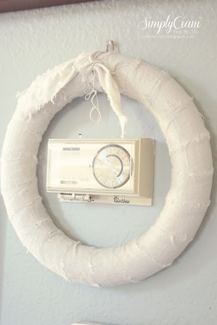 Thermostats are always ugly and I have never figured out how to hide ours, so why not frame it?! With this styrofoam wreath and linen fabric make a cute Mummy Wreath