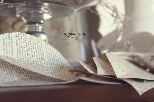 For the leafy book page garland, I originally got the inspiration from Nesting Place - The Blog, and wanted to make my own version. I started by folding book pages in half, then cutting random leaf shapes out of them. I used a hole punch, then strung them using twine (tying a knot after each leaf)