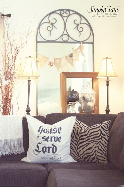 Being that this is only our 2nd Halloween since getting Married and having a home together, we honestly had no Halloween decor to start with... just a few plastic pumpkins from last year & cheap ugly garland from Michaels. I am the kind of person who loves decorating my home each and every season and changing things up. But being a Military family, our paychecks don't leave much extra room to go out and spontaniously spend on seasonal decor. My goal this year was to decorate our whole home (well.. the rooms that are actually lived in) for under $50. Since I found many of the items that you see in the pictures, around my home, it made it much easier to stay within budget. Although, even if you had to go out and buy supplies you would still be able to stay under $75 (at the very most)